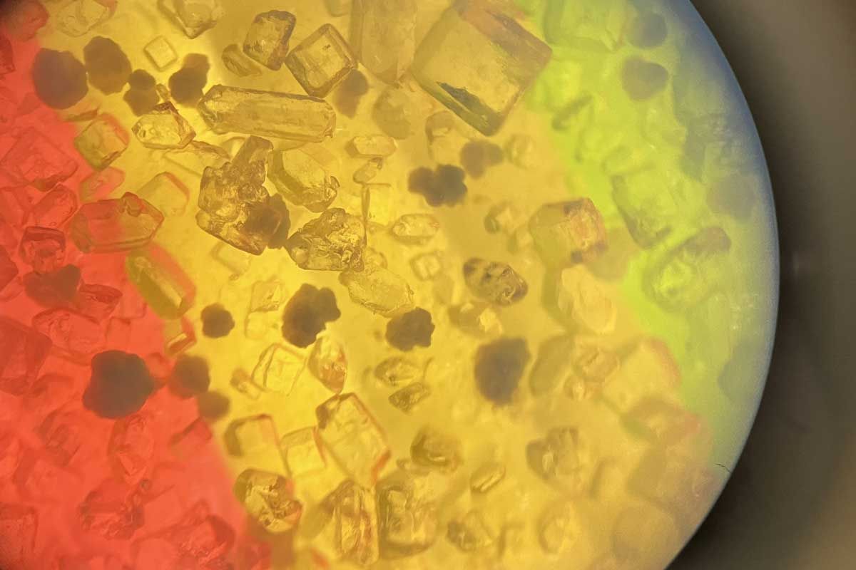 He explains that the entire process lasts only a few seconds; catch it too early or too late, and you’ll miss the “sweet spot”. Using a fluorescent microscope at 4x magnification, the team timed each shot precisely to capture the reaction, allowing them to see the candy dissolving, reforming and fluorescing.